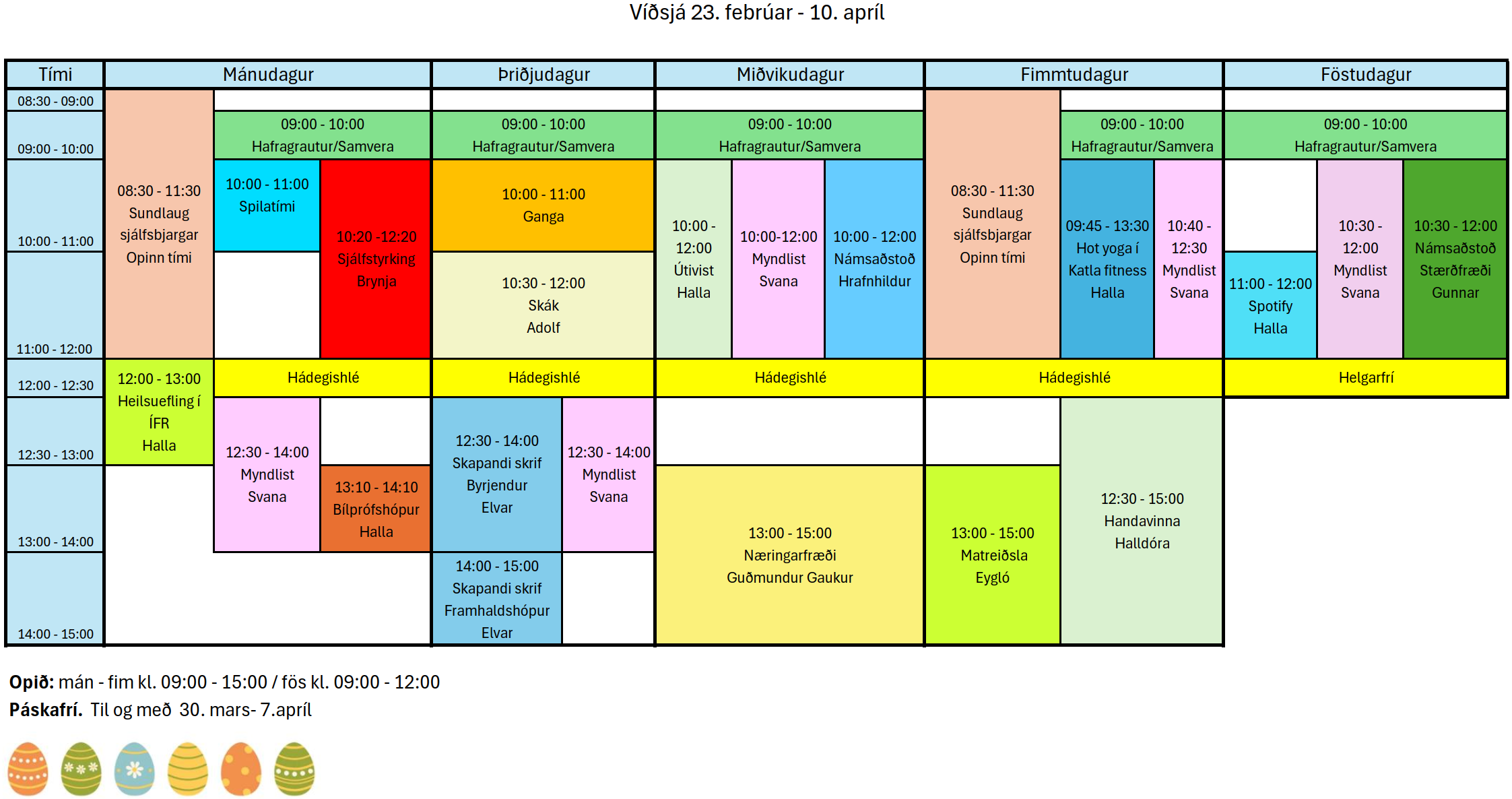 Hægt er að sæka PDF útgáfu af stundatöflunni fyrir 23. febrúar – 10. apríl HÉRNA.